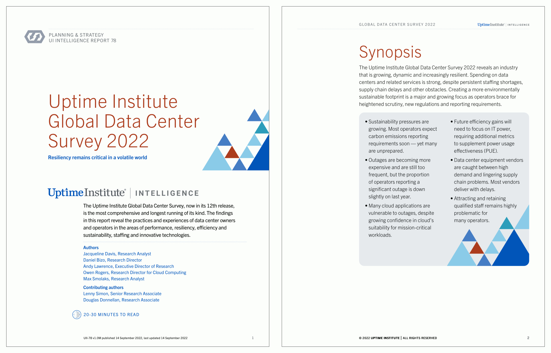 The Uptime Institute Global Data Center Survey 2022 reveals an industry that is growing, dynamic and increasingly resilient. Spending on data centers and related services is strong, despite persistent staffing shortages, supply chain delays and other obstacles. Creating a more environmentally sustainable footprint is a major and growing focus as operators brace for heightened scrutiny, new regulations and reporting requirements.